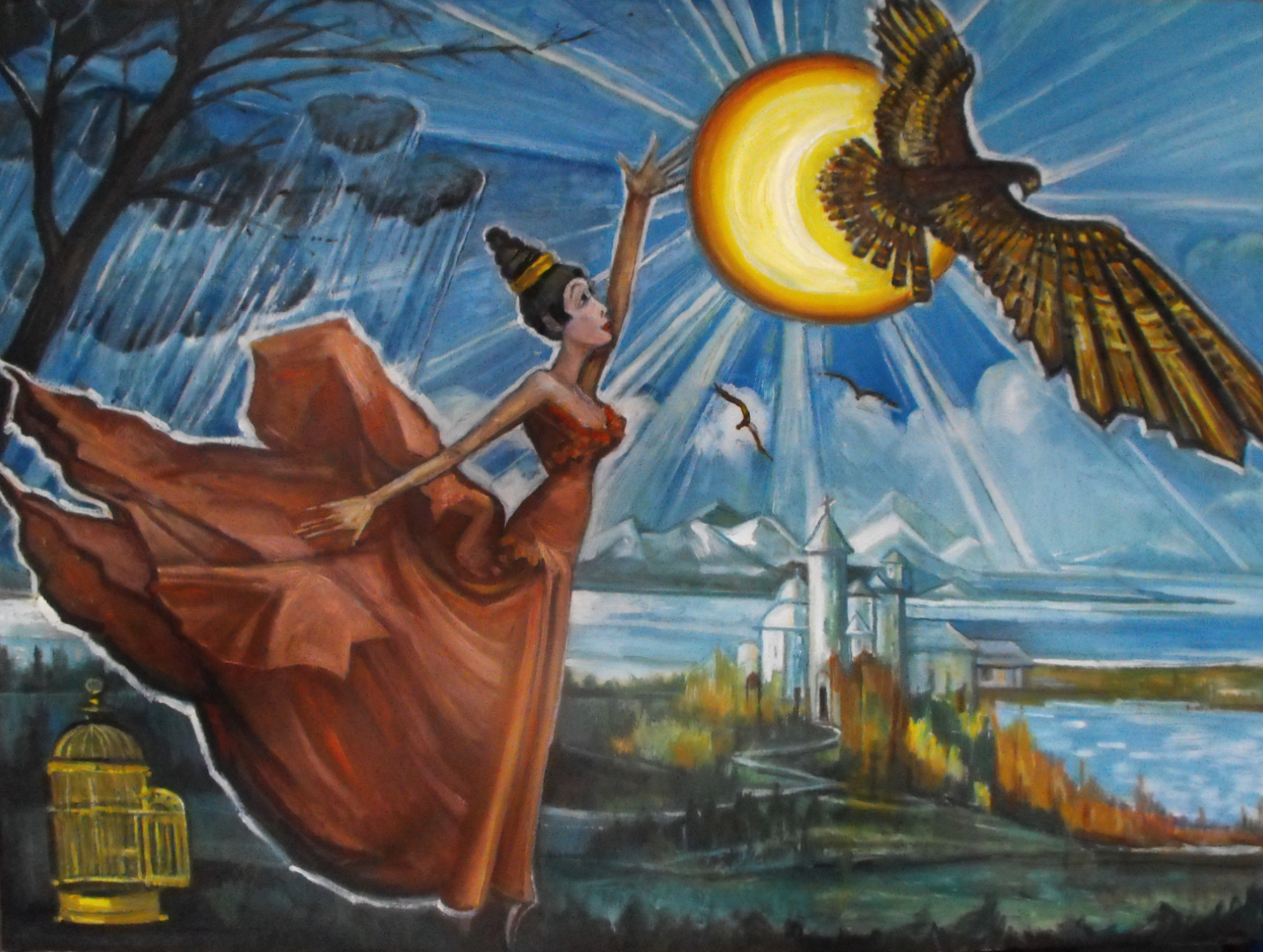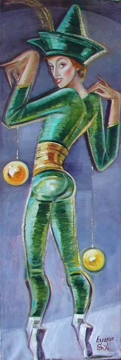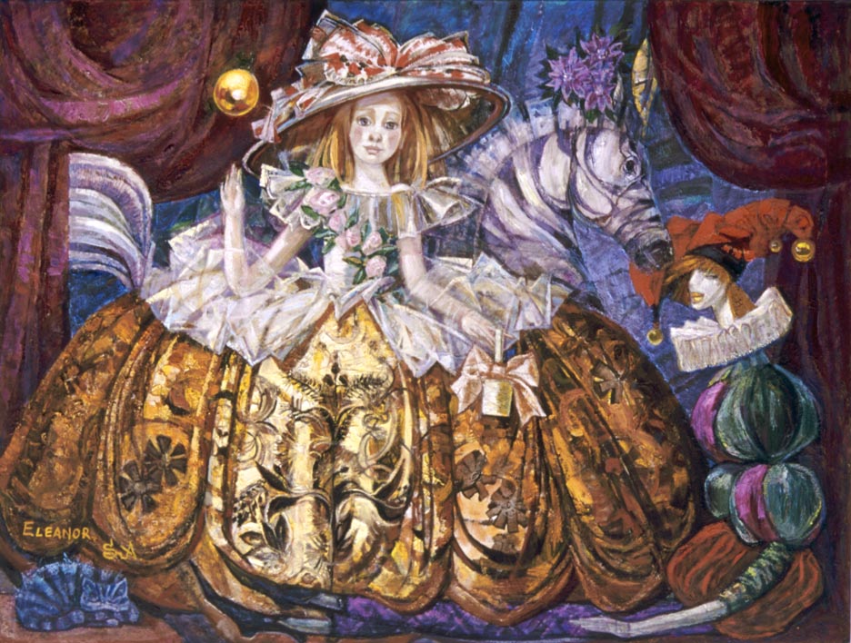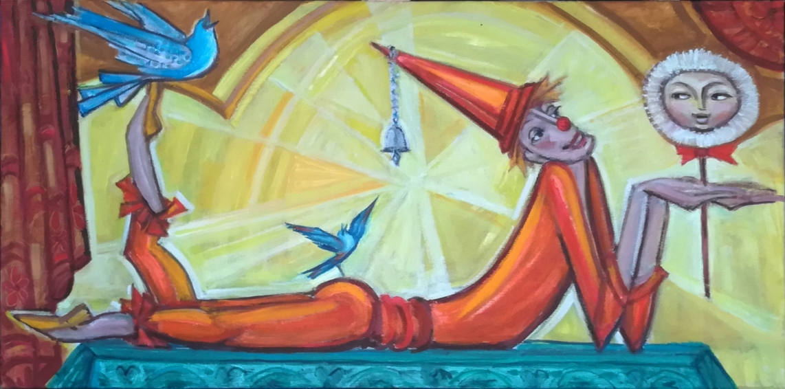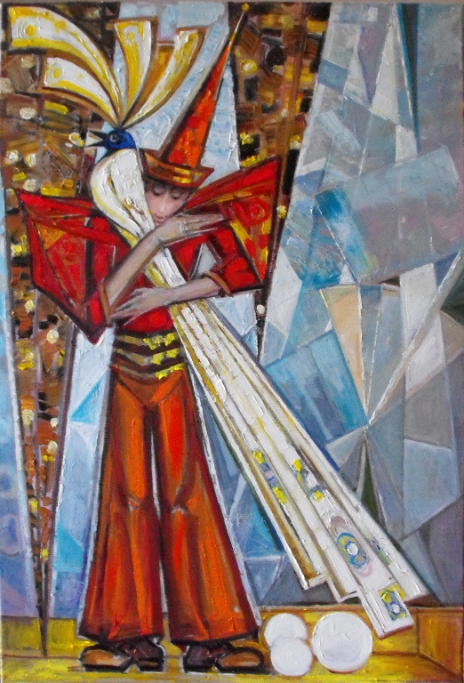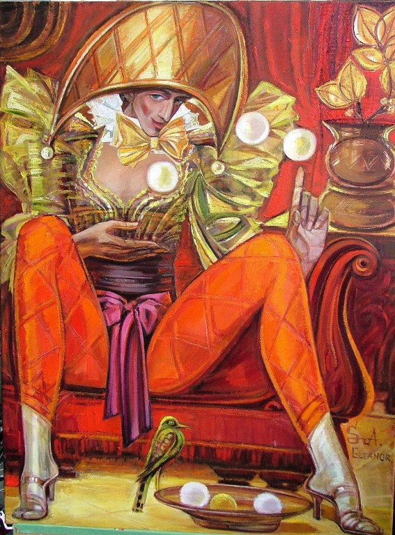 Harlequin with Bluebird Canvas, oil 24x34 inches