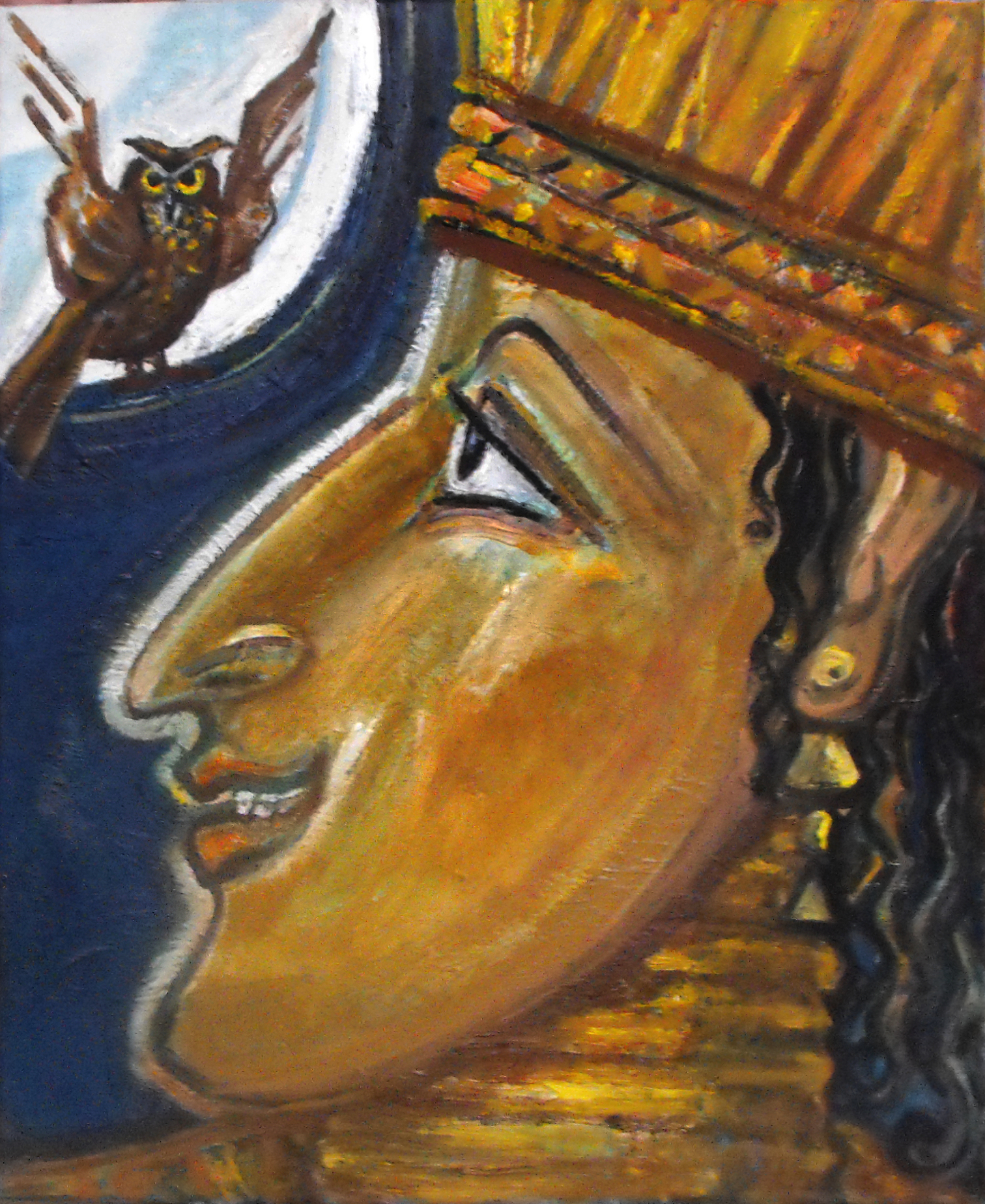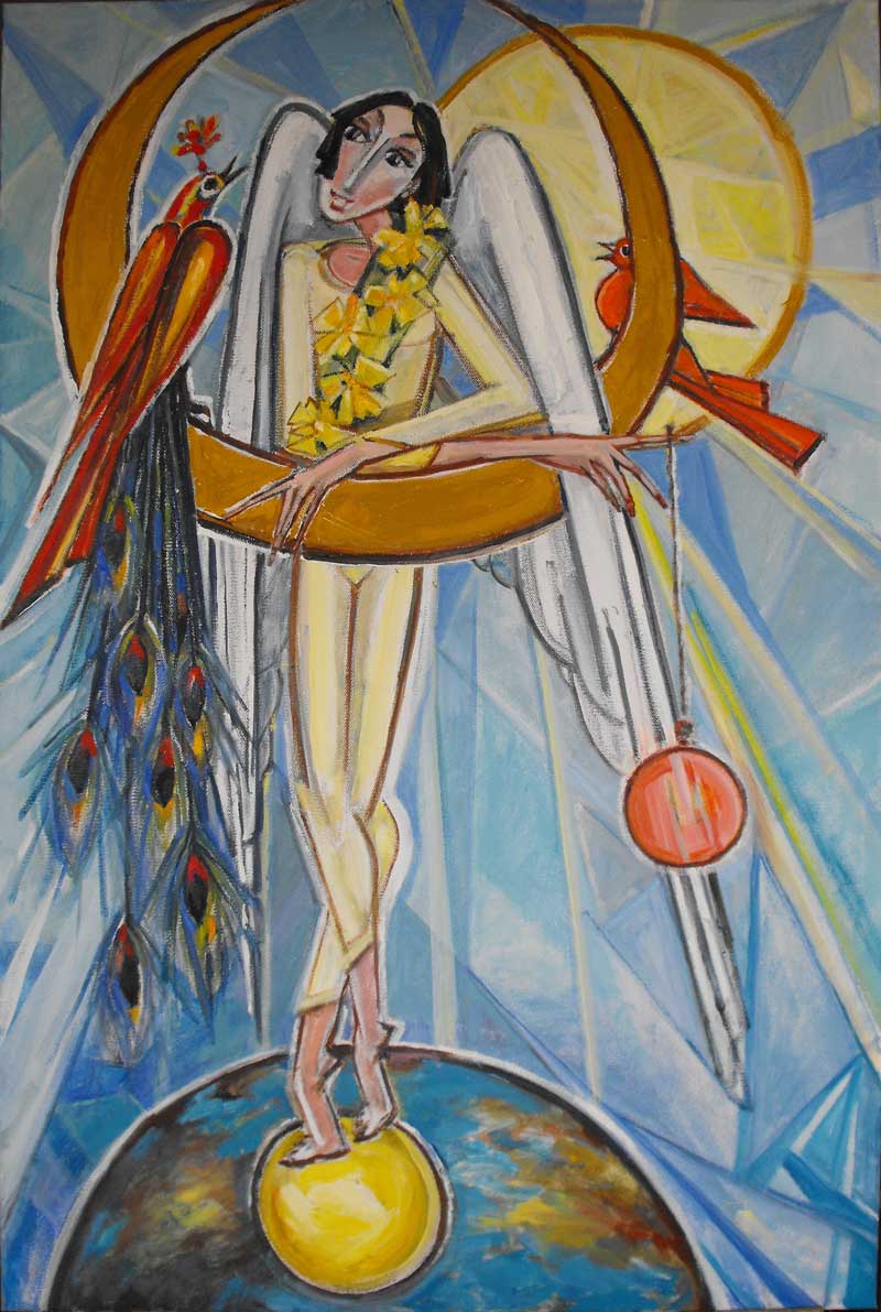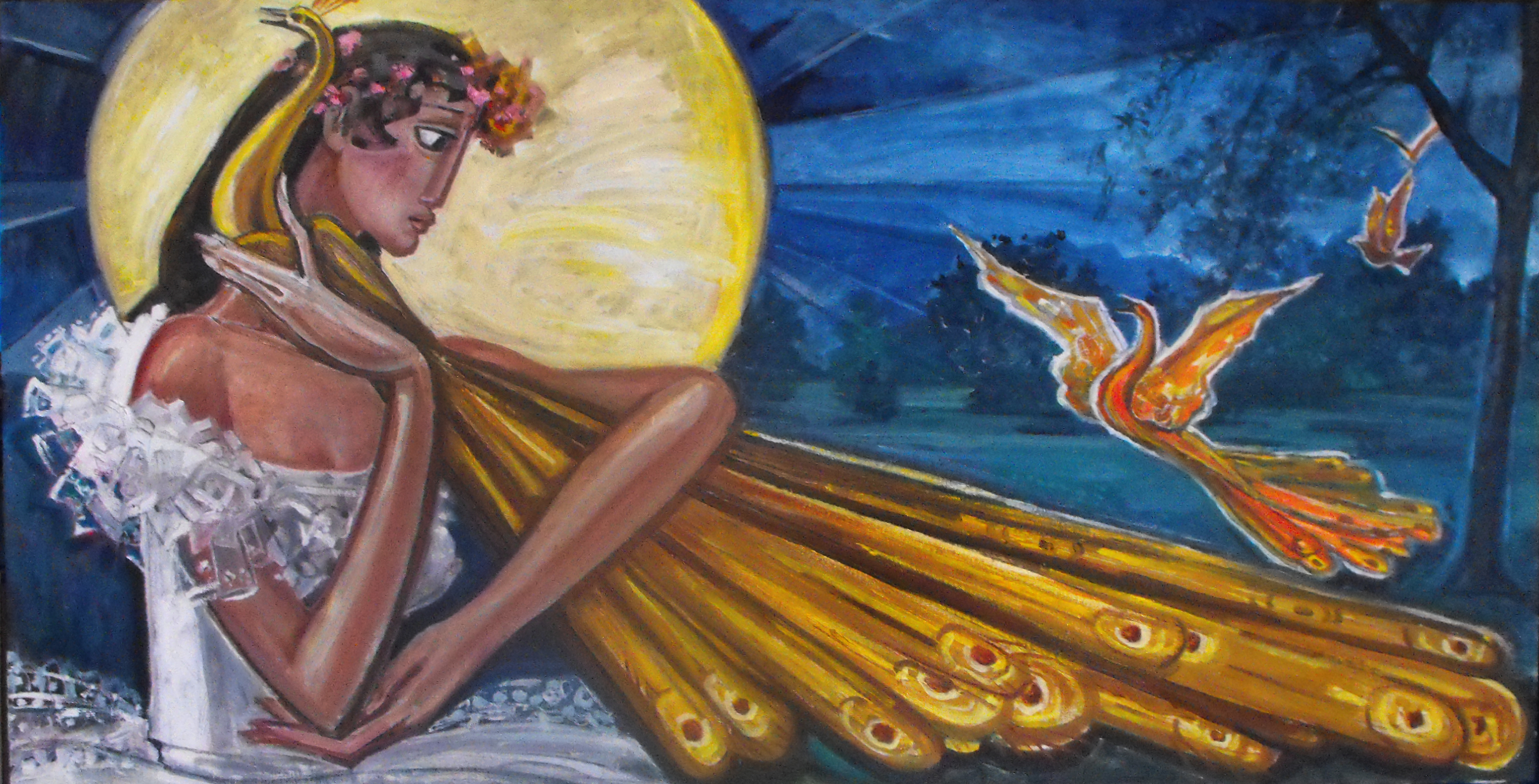 Harlequin with Bluebird Canvas, oil 24x34 inches